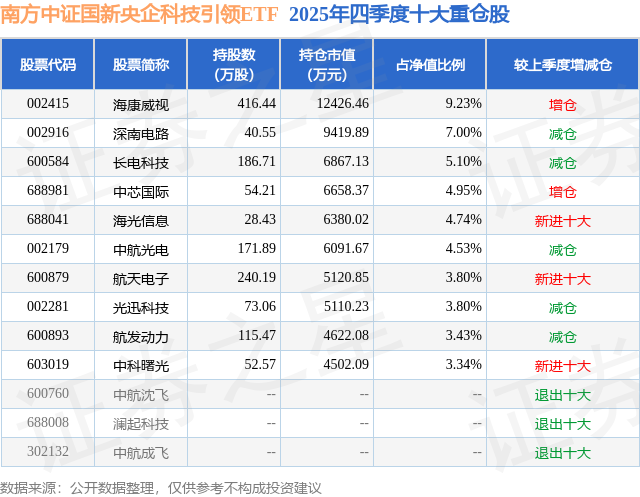 南方中证国新央企科技引领ETF基金成立于2023年6月21日,基金经理为李佳亮,基金跟踪标的为中证国新央企科技引领指数,成立以来超额回报为2.82%,近一个月超额回报为-0.02%。最新披露的基金持仓数据显示,截止2025年12月31日,该基金第一大重仓股为海康威视(002415),持股占比为9.23%。