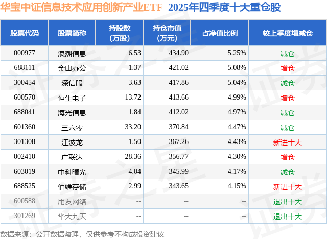 华宝中证信息技术应用创新产业ETF基金成立于2023年9月26日,基金经理为张放,基金跟踪标的为中证信息技术应用创新产业指数,成立以来超额回报为-6.41%,近一个月超额回报为-0.46%。最新披露的基金持仓数据显示,截止2025年12月31日,该基金第一大重仓股为浪潮信息(000977),持股占比为5.25%。