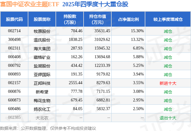 富国中证农业主题ETF基金成立于2020年12月10日,基金经理为张圣贤,基金跟踪标的为中证农业主题指数,成立以来超额回报为5.11%,近一个月超额回报为-0.07%。最新披露的基金持仓数据显示,截止2025年12月31日,该基金第一大重仓股为牧原股份(002714),持股占比为15.3%。