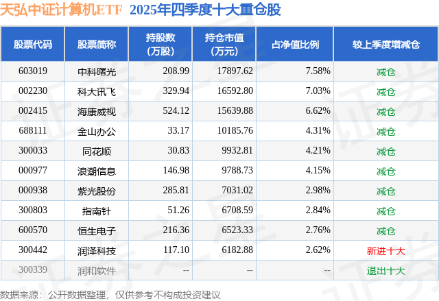 天弘中证计算机ETF基金成立于2020年3月20日,基金经理为林心龙 洪明华,基金跟踪标的为中证计算机主题指数,成立以来超额回报为11.18%,近一个月超额回报为-0.07%。最新披露的基金持仓数据显示,截止2025年12月31日,该基金第一大重仓股为中科曙光(603019),持股占比为7.58%。