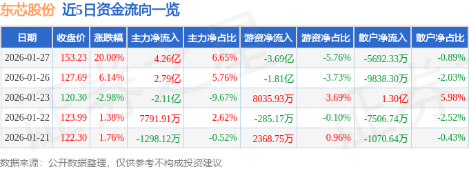 证券之星消息,截至2026年1月27日收盘,东芯股份(688110)报收于153.23元,上涨20.0%,涨停,换手率9.85%,成交量43.55万手,成交额64.08亿元。