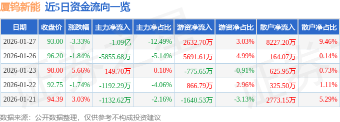 证券之星消息,截至2026年1月27日收盘,厦钨新能(688778)报收于93.0元,下跌3.33%,换手率1.86%,成交量9.41万手,成交额8.69亿元。