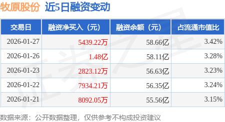 证券之星消息,1月27日,牧原股份(002714)融资买入2.51亿元,融资偿还1.97亿元,融资净买入5439.22万元,融资余额58.66亿元,近3个交易日已连续净买入累计2.3亿元,近20个交易日中有16个交易日出现融资净买入。