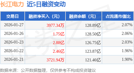 证券之星消息,1月27日,长江电力(600900)融资买入2.35亿元,融资偿还1.95亿元,融资净买入3977.34万元,融资余额128.89亿元,近3个交易日已连续净买入累计5.02亿元,近20个交易日中有16个交易日出现融资净买入。