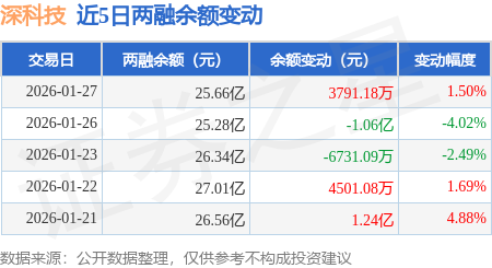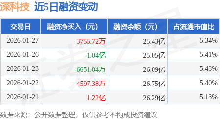 证券之星消息,1月27日,深科技(000021)融资买入4.62亿元,融资偿还4.25亿元,融资净买入3755.72万元,融资余额25.43亿元,近20个交易日中有11个交易日出现融资净买入。