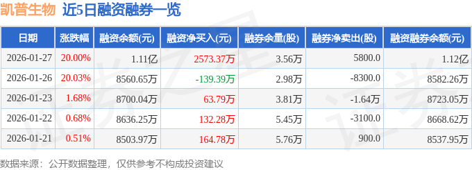 凯普生物融资融券信息显示,融资方面,当日融资买入1.01亿元,融资偿还7493.21万元,融资净买入2573.37万元。融券方面,融券卖出5800.0股,融券偿还0.0股,融券余量3.56万股,融券余额30.97万元。融资融券余额1.12亿元。