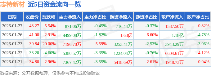 证券之星消息,截至2026年1月27日收盘,志特新材(300986)报收于43.27元,上涨5.54%,换手率11.21%,成交量46.14万手,成交额19.36亿元。