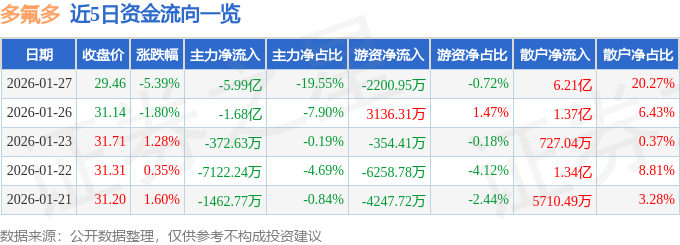 证券之星消息,截至2026年1月27日收盘,多氟多(002407)报收于29.46元,下跌5.39%,换手率9.68%,成交量104.65万手,成交额30.63亿元。