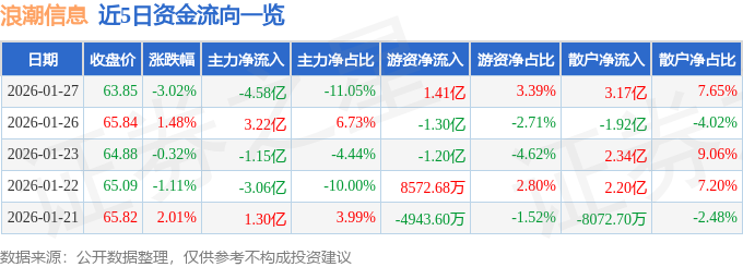 证券之星消息,截至2026年1月27日收盘,浪潮信息(000977)报收于63.85元,下跌3.02%,换手率4.47%,成交量65.53万手,成交额41.47亿元。