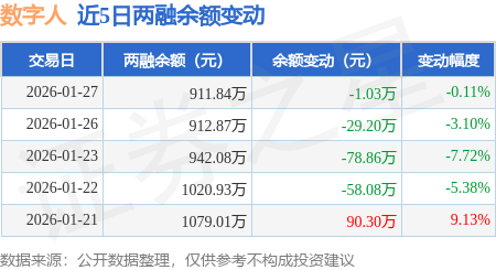 证券之星消息,1月27日,数字人(920670)融资买入48.2万元,融资偿还49.23万元,融资净卖出1.03万元,融资余额911.84万元。
