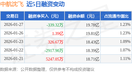 证券之星消息,1月27日,中航沈飞(600760)融资买入1.24亿元,融资偿还1.27亿元,融资净卖出339.32万元,融资余额19.78亿元。
