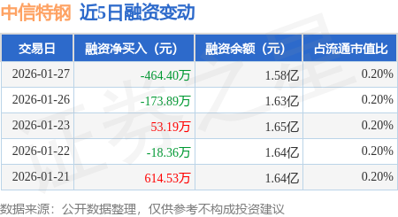 证券之星消息,1月27日,中信特钢(000708)融资买入1425.67万元,融资偿还1890.07万元,融资净卖出464.4万元,融资余额1.58亿元。