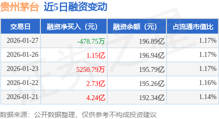 证券之星消息,1月27日,贵州茅台(600519)融资买入4.53亿元,融资偿还4.57亿元,融资净卖出478.75万元,融资余额196.89亿元,近20个交易日中有13个交易日出现融资净买入。