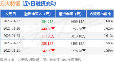 证券之星消息,1月27日,方大特钢(600507)融资买入1182.35万元,融资偿还1776.59万元,融资净卖出594.24万元,融资余额8659.14万元,近20个交易日中有13个交易日出现融资净买入。