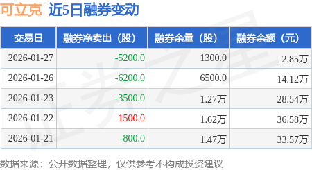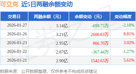 证券之星消息,1月27日,可立克(002782)融资买入2752.61万元,融资偿还3441.06万元,融资净卖出688.46万元,融资余额3.14亿元,近20个交易日中有12个交易日出现融资净买入。