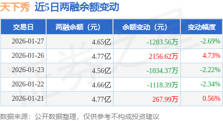证券之星消息,1月27日,天下秀(600556)融资买入1.11亿元,融资偿还1.24亿元,融资净卖出1298.53万元,融资余额4.61亿元。