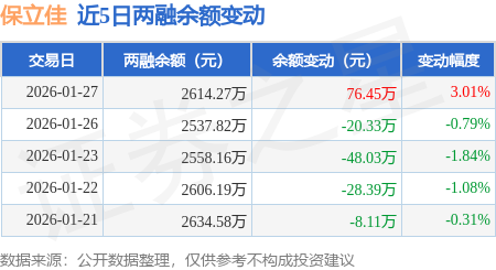 证券之星消息,1月27日,保立佳(301037)融资买入375.64万元,融资偿还299.19万元,融资净买入76.45万元,融资余额2614.27万元。