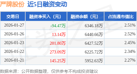 证券之星消息,1月27日,严牌股份(301081)融资买入624.31万元,融资偿还718.78万元,融资净卖出94.47万元,融资余额6346.18万元,近20个交易日中有12个交易日出现融资净买入。