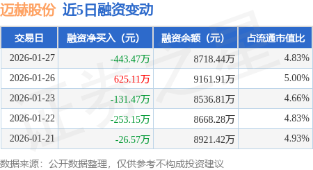 证券之星消息,1月27日,迈赫股份(301199)融资买入793.96万元,融资偿还1237.43万元,融资净卖出443.47万元,融资余额8718.44万元。