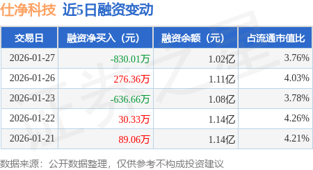 证券之星消息,1月27日,仕净科技(301030)融资买入692.31万元,融资偿还1522.33万元,融资净卖出830.01万元,融资余额1.02亿元。