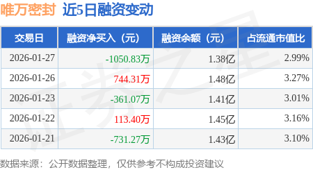 证券之星消息,1月27日,唯万密封(301161)融资买入693.93万元,融资偿还1744.76万元,融资净卖出1050.83万元,融资余额1.38亿元。