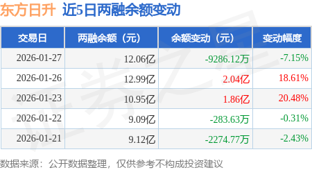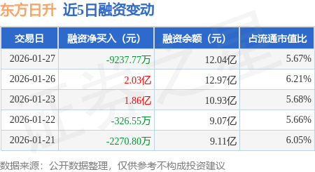 证券之星消息,1月27日,东方日升(300118)融资买入5.49亿元,融资偿还6.42亿元,融资净卖出9237.77万元,融资余额12.04亿元,近20个交易日中有11个交易日出现融资净买入。