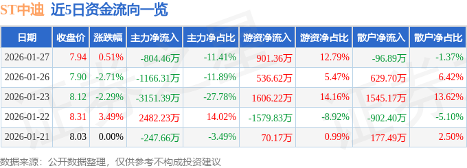 1月27日的资金流向数据方面,主力资金净流出804.46万元,占总成交额11.41%,游资资金净流入901.36万元,占总成交额12.79%,散户资金净流出96.89万元,占总成交额1.37%。