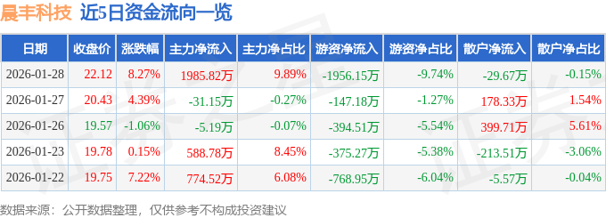 证券之星消息,截至2026年1月28日收盘,晨丰科技(603685)报收于22.12元,上涨8.27%,换手率4.62%,成交量9.3万手,成交额2.01亿元。