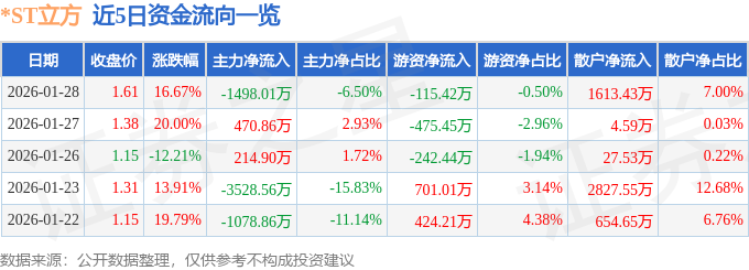 证券之星消息,截至2026年1月28日收盘,*ST立方(300344)报收于1.61元,上涨16.67%,换手率23.84%,成交量152.56万手,成交额2.3亿元。