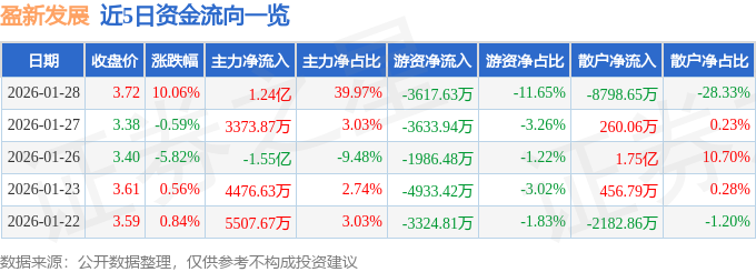 证券之星消息,截至2026年1月28日收盘,盈新发展(000620)报收于3.72元,上涨10.06%,换手率1.79%,成交量83.5万手,成交额3.11亿元。