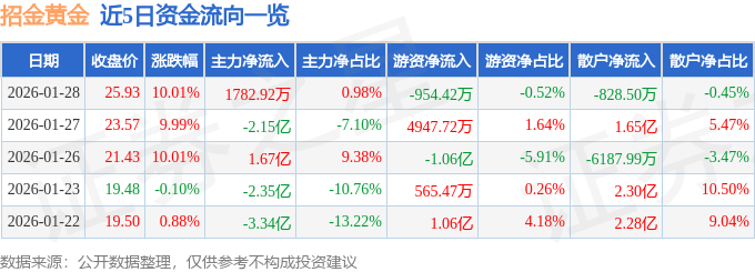 证券之星消息,截至2026年1月28日收盘,招金黄金(000506)报收于25.93元,上涨10.01%,换手率7.67%,成交量71.26万手,成交额18.21亿元。