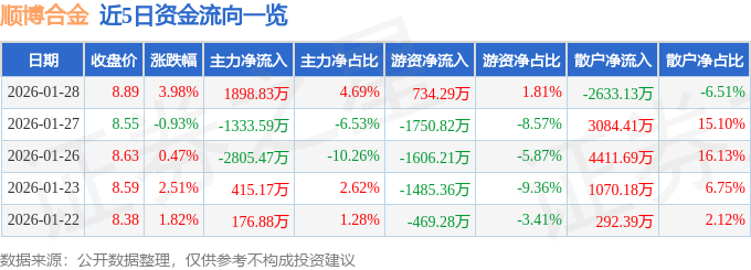 证券之星消息,截至2026年1月28日收盘,顺博合金(002996)报收于8.89元,上涨3.98%,换手率11.28%,成交量45.78万手,成交额4.05亿元。
