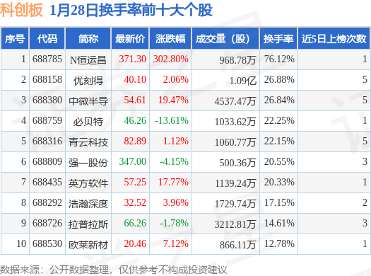 当日科创板换手率前10大个股中7只个股收涨,平均涨幅50.61%,其中N恒运昌(688785)以换手率76.12%排第一,6只个股近5个交易日中多次上榜。