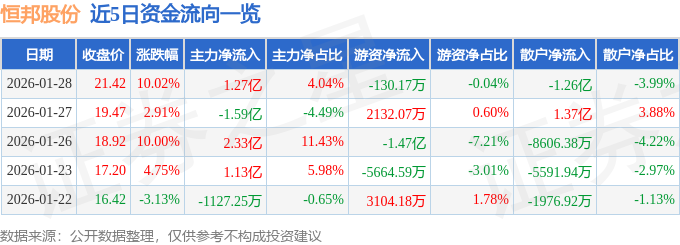 证券之星消息,恒邦股份1月28日涨停收盘,收盘价21.42元。该股于11点26分涨停,6次打开涨停,截止收盘封单资金为7507.58万元,占其流通市值0.29%。