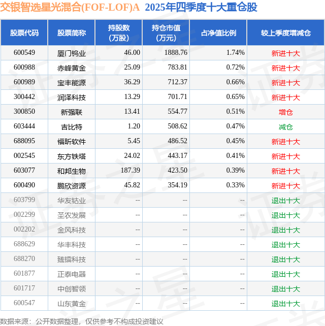 根据2025基金年报公募基金重仓股数据,重仓该股的公募基金共1家,其中持有数量最多的公募基金为交银施罗德基金的交银智选星光混合(FOF-LOF)A。交银智选星光混合(FOF-LOF)A目前规模为9.16亿元,最新净值1.1401(1月26日),较上一交易日上涨0.3%,近一年上涨51.09%。该公募基金现任基金经理为刘兵。刘兵在任的基金产品包括:交银兴享一年持有期混合(FOF)A,管理时间为2021年12月1日至今,期间收益率为13.99%;交银优享一年持有混合(FOF)A,管理时间为2022年1月27日至今,期间收益率为6.34%;交银养老2035三年(FOF)A,管理时间为2023年1月7日至今,期间收益率为18.47%。