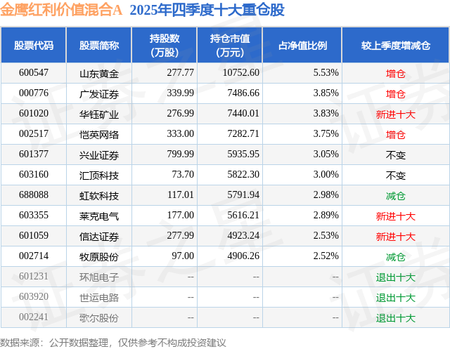 根据2025基金年报公募基金重仓股数据,重仓该股的公募基金共4家,其中持有数量最多的公募基金为金鹰基金的金鹰红利价值混合A。金鹰红利价值混合A目前规模为14.29亿元,最新净值2.6606(1月27日),较上一交易日上涨0.26%,近一年上涨32.03%。该公募基金现任基金经理为陈颖 张展华。陈颖在任的基金产品包括:金鹰核心资源混合A,管理时间为2019年1月26日至今,期间收益率为286.46%;金鹰科技创新股票A,管理时间为2021年5月18日至今,期间收益率为144.78%;金鹰科技致远混合A,管理时间为2024年3月19日至今,期间收益率为99.45%。张展华在任的基金产品包括:金鹰中小盘精选混合A,管理时间为2024年1月19日至今,期间收益率为71.73%;金鹰智慧生活混合A,管理时间为2025年1月11日至今,期间收益率为22.59%。