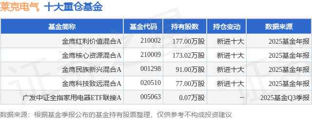 重仓莱克电气的公募基金请见下表:
