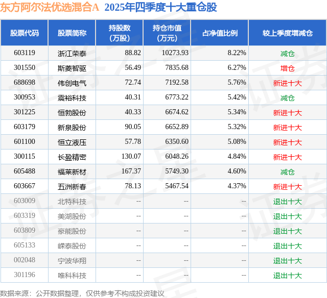 东方阿尔法优选混合A的前十大重仓股如下:
