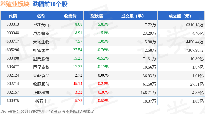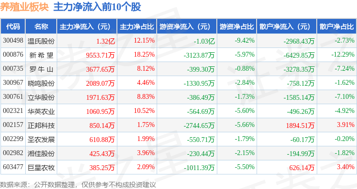 从资金流向上来看,当日养殖业板块主力资金净流入1.63亿元,游资资金净流出3.11亿元,散户资金净流入1.49亿元。养殖业板块个股资金流向见下表: