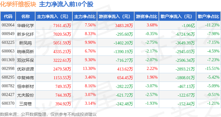 从资金流向上来看,当日化学纤维板块主力资金净流入1.53亿元,游资资金净流入3467.32万元,散户资金净流出1.88亿元。化学纤维板块个股资金流向见下表:
