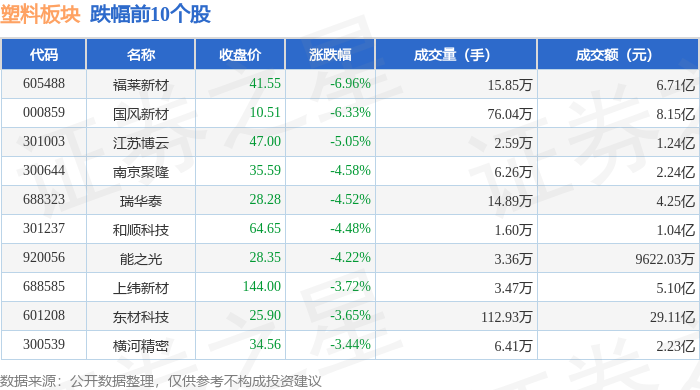 证券之星消息,1月28日塑料板块较上一交易日下跌1.71%,福莱新材领跌。当日上证指数报收于4151.24,上涨0.27%。深证成指报收于14342.9,上涨0.09%。塑料板块个股涨跌见下表: