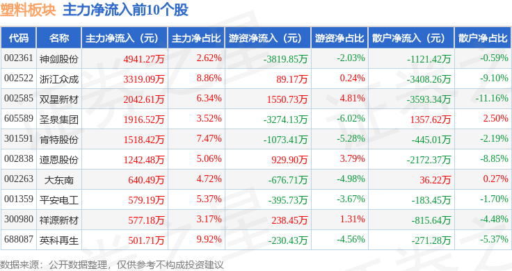 从资金流向上来看,当日塑料板块主力资金净流出13.65亿元,游资资金净流入1.34亿元,散户资金净流入12.31亿元。塑料板块个股资金流向见下表: