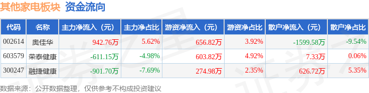 从资金流向上来看,当日其他家电板块主力资金净流出570.09万元,游资资金净流入1535.62万元,散户资金净流出965.52万元。其他家电板块个股资金流向见下表: