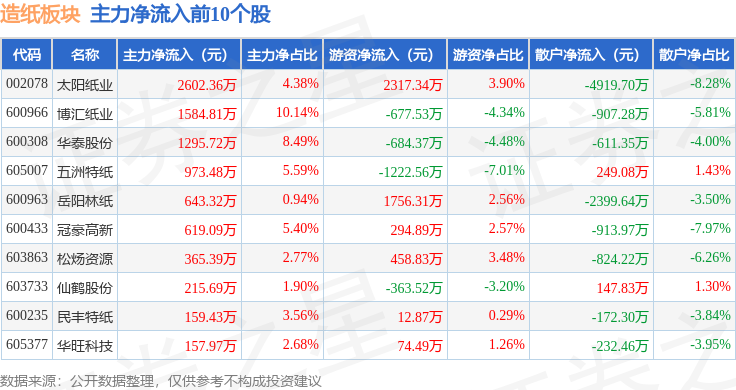 从资金流向上来看,当日造纸板块主力资金净流出2532.6万元,游资资金净流入2774.88万元,散户资金净流出242.28万元。造纸板块个股资金流向见下表: