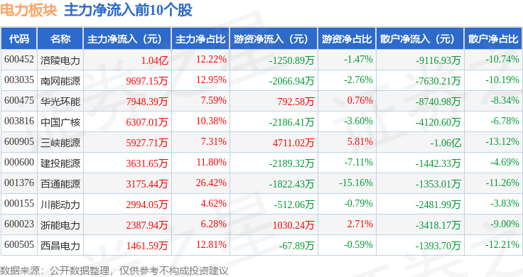 从资金流向上来看,当日电力板块主力资金净流出19.56亿元,游资资金净流入2866.63万元,散户资金净流入19.27亿元。电力板块个股资金流向见下表: