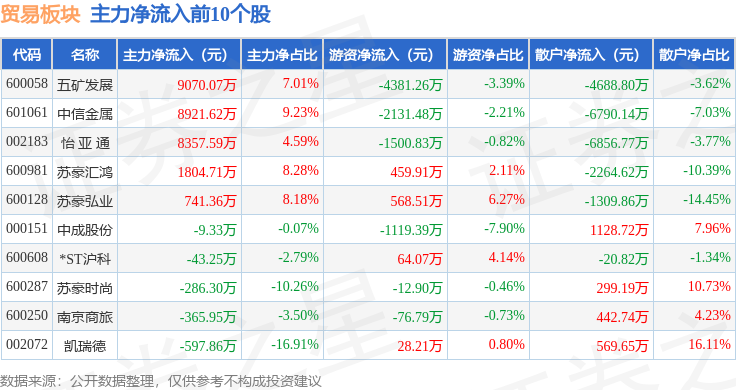 从资金流向上来看,当日贸易板块主力资金净流入2.39亿元,游资资金净流出8329.32万元,散户资金净流出1.55亿元。贸易板块个股资金流向见下表: