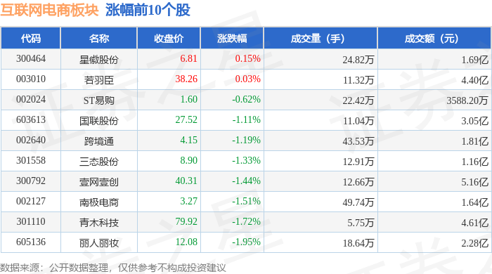 证券之星消息,1月28日互联网电商板块较上一交易日下跌1.55%,凯淳股份领跌。当日上证指数报收于4151.24,上涨0.27%。深证成指报收于14342.9,上涨0.09%。互联网电商板块个股涨跌见下表: