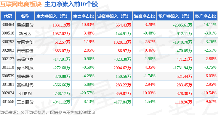 从资金流向上来看,当日互联网电商板块主力资金净流出1.72亿元,游资资金净流出197.93万元,散户资金净流入1.74亿元。互联网电商板块个股资金流向见下表: