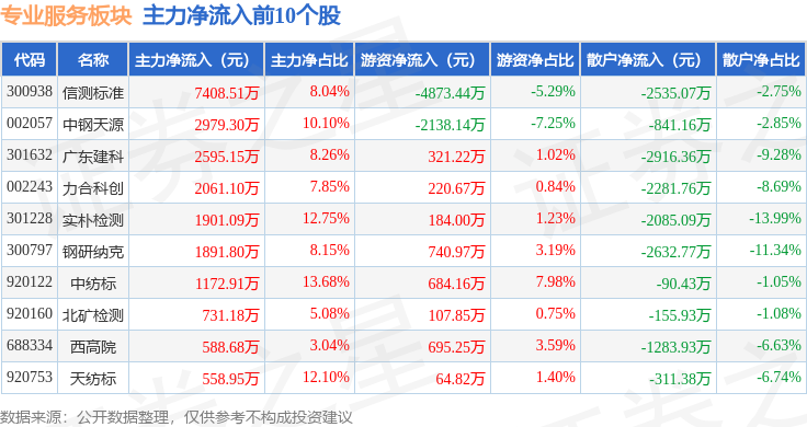 从资金流向上来看,当日专业服务板块主力资金净流出1.03亿元,游资资金净流出2087.99万元,散户资金净流入1.24亿元。专业服务板块个股资金流向见下表: