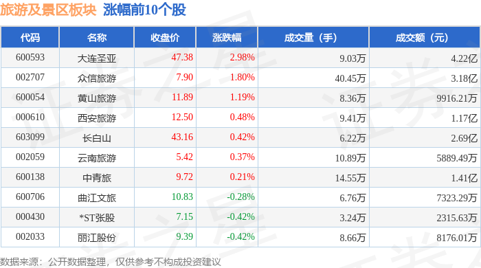 证券之星消息,1月28日旅游及景区板块较上一交易日下跌0.53%,陕西旅游领跌。当日上证指数报收于4151.24,上涨0.27%。深证成指报收于14342.9,上涨0.09%。旅游及景区板块个股涨跌见下表: